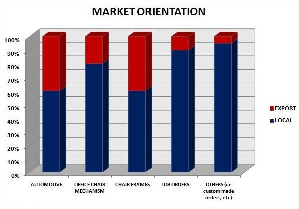 Every month, PT. NUSAMULTI CENTRALESTARI has an output equivalent to 2,500,000 strokes, that’s 30,000,000 strokes per year. This output can be increased by varying the labor shift up to 3-shifts per day. All those strokes are divided into different kind of products, and the average of the manufactured items produced can be seen from the chart below as well as the market orientation: